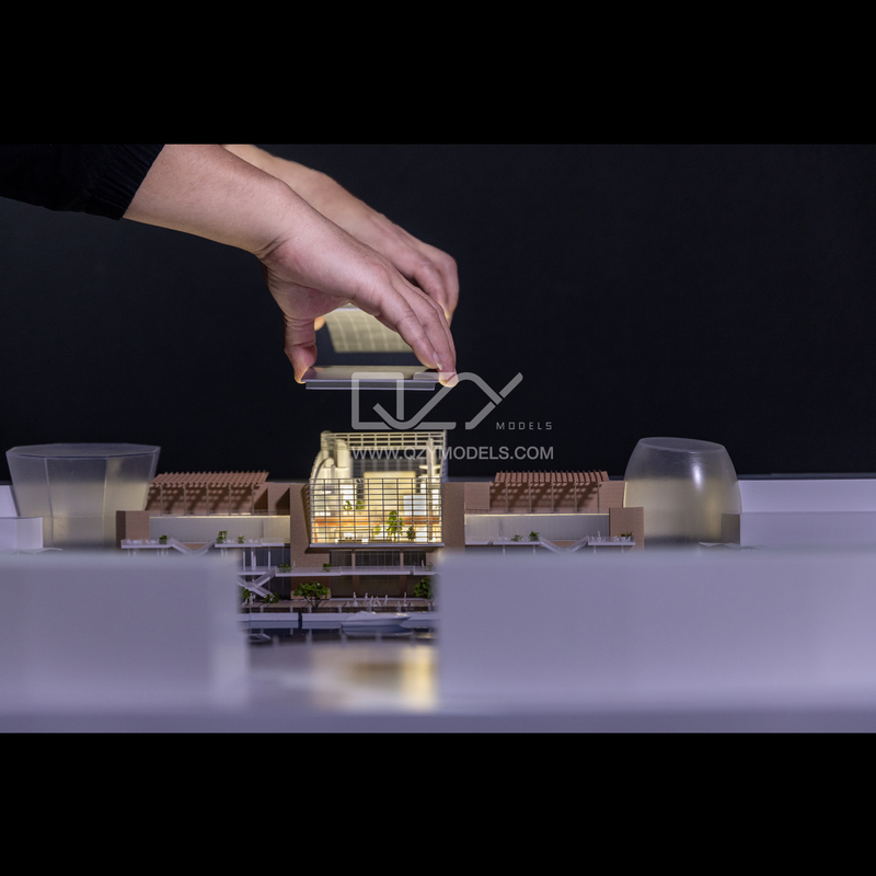 De transparante acryl heeft een glazuurige textuur, zoals een zachte sluier.Het interieur van het model licht zichtbaar maken en een unieke wazigheid creërenDe belangrijkste gevel van het commerciële complex heeft een botsing van lichtbruine en bruinwitte tinten. De warme en zware lichtbruine en de beknopte en heldere bruinwitte completeren elkaar.Samen met het rivierkanaal dat het echte wateroppervlak simulateert, kunnen de drie gebouwen onderling worden afgeweken en de primaire en secundaire relaties van de gebouwen duidelijk worden geïdentificeerd.Het creëren van een harmonieuze en hiërarchische algemene indruk.